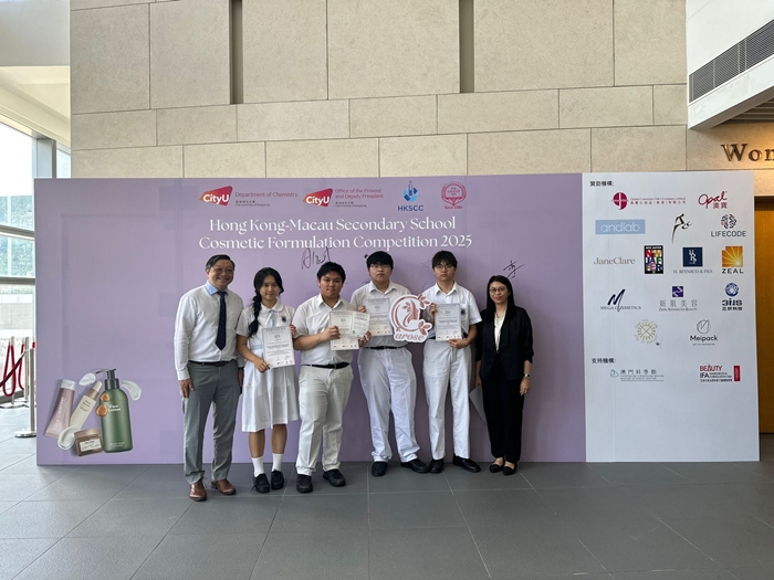 4位同學分別為6D張俊軒、劉卓欣、潘建宏及胡亮(指導老師:張家敏老師)於暑假期間參加由香港城市大學(首席及常務副校長室、化學系)、香港化妝品化學師協會 及 香港化妝品同業協會共同舉辦的 「2025年港澳中學化妝品配方比賽」,體驗科學實驗的樂趣,將化學知識融入生活。